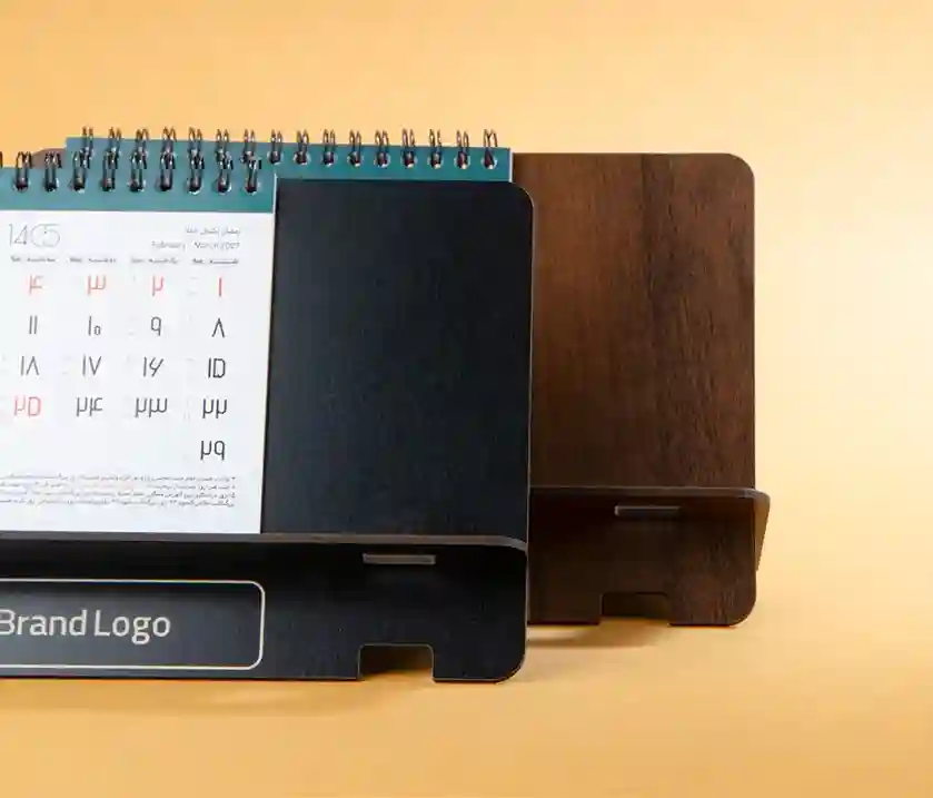 پایه تقویم از MDF با ضخامت ۳ میل ساخته شده و در رنگهای مشکی و گردویی تولید میشود. این ساختار باعث استحکام بالای محصول شده و جلوهای حرفهای و رسمی به میز کار میبخشد.